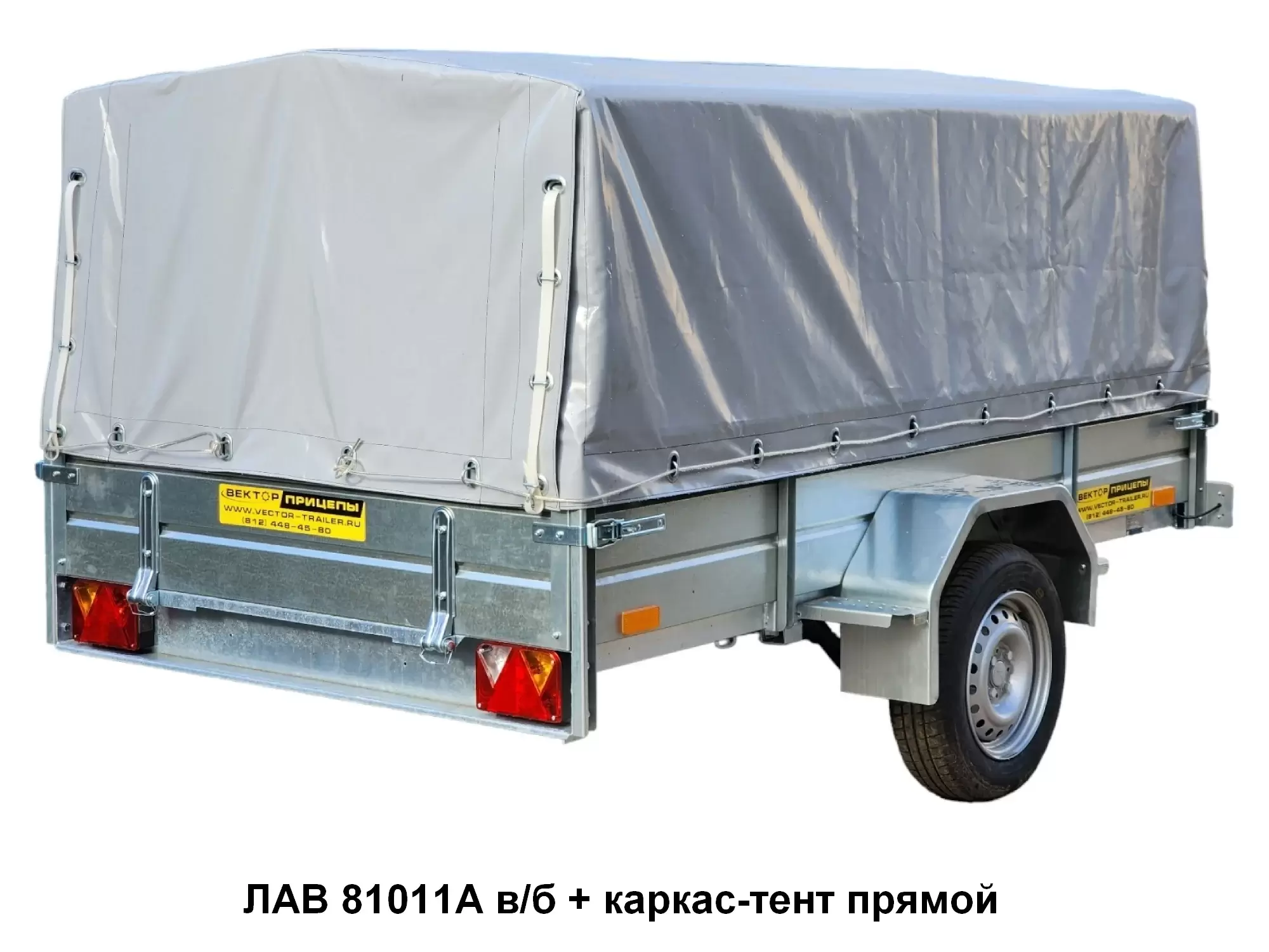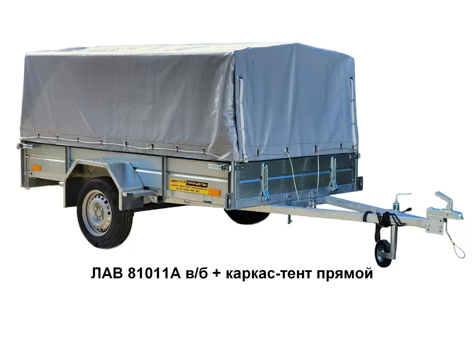Легковой прицеп ЛАВ 81011А предназначен для перевозки различных грузов, в т.ч. мотоцикла, квадроцикла по всем видам дорог, на которых допускается эксплуатация легковых автомобилей. Рама, дышло и ось прицепа полностью оцинкованы методом горячего цинкования изнутри и снаружи. Борта и крылья из оцинкованной стали. Прицеп одноосный, без тормозов, снабжен откидным кузовом, передний и задний борта откидные, с возможностью быстрого съёма. Дышло V-образное. Днище - ламинированная фанера. Подвеска колес (R13) на двух полуэллиптических переменного сечения рессорах с гидравлическими амортизаторами. Размеры кузова 2500*1400 мм. Высота бортов 240 или 380 мм. Грузоподъёмность 485 кг. Опорное колесо, регулятор высоты сцепного устройства, кронштейн запасного колеса и металлические подножки - в стандартной комплектации.