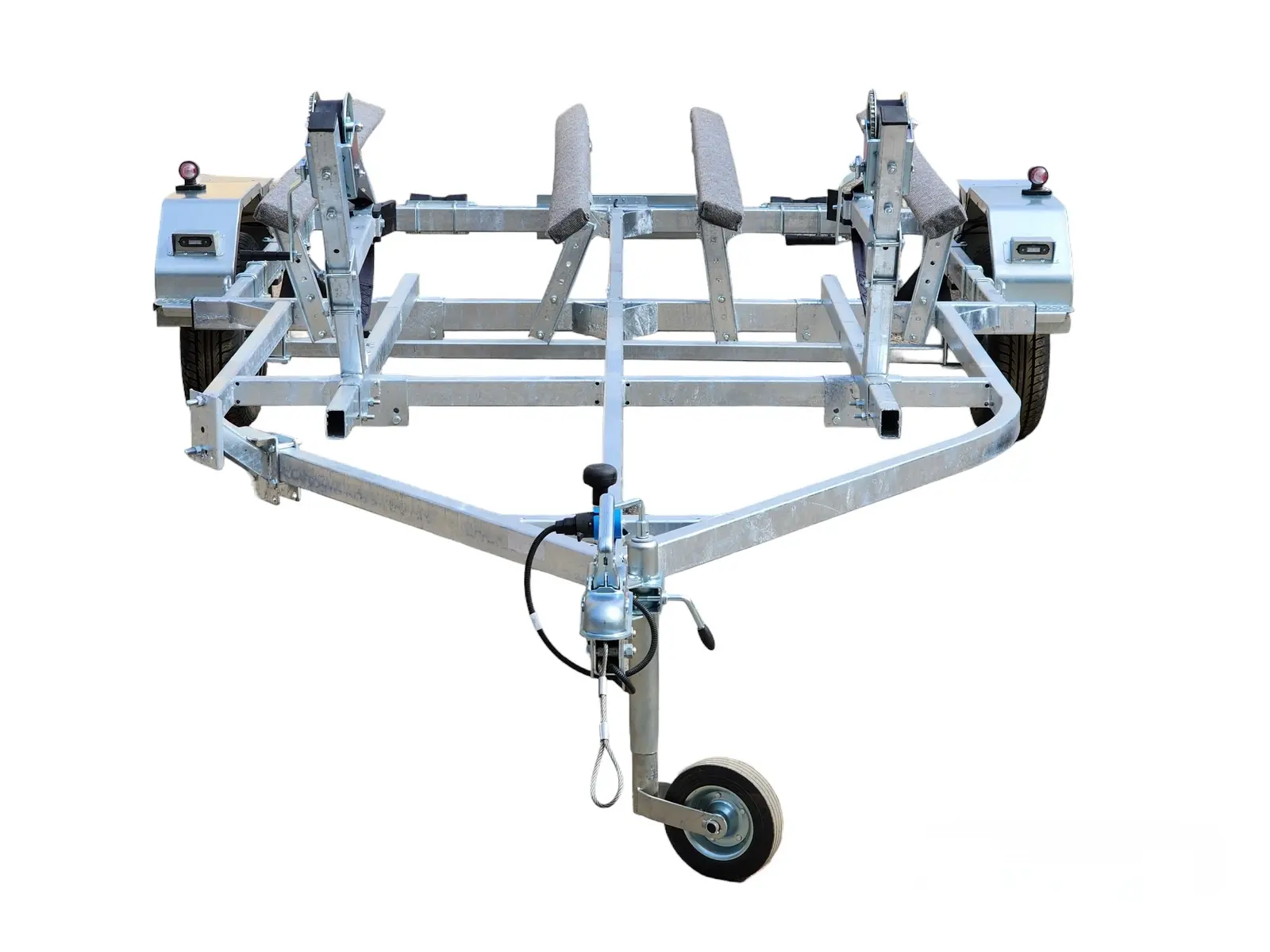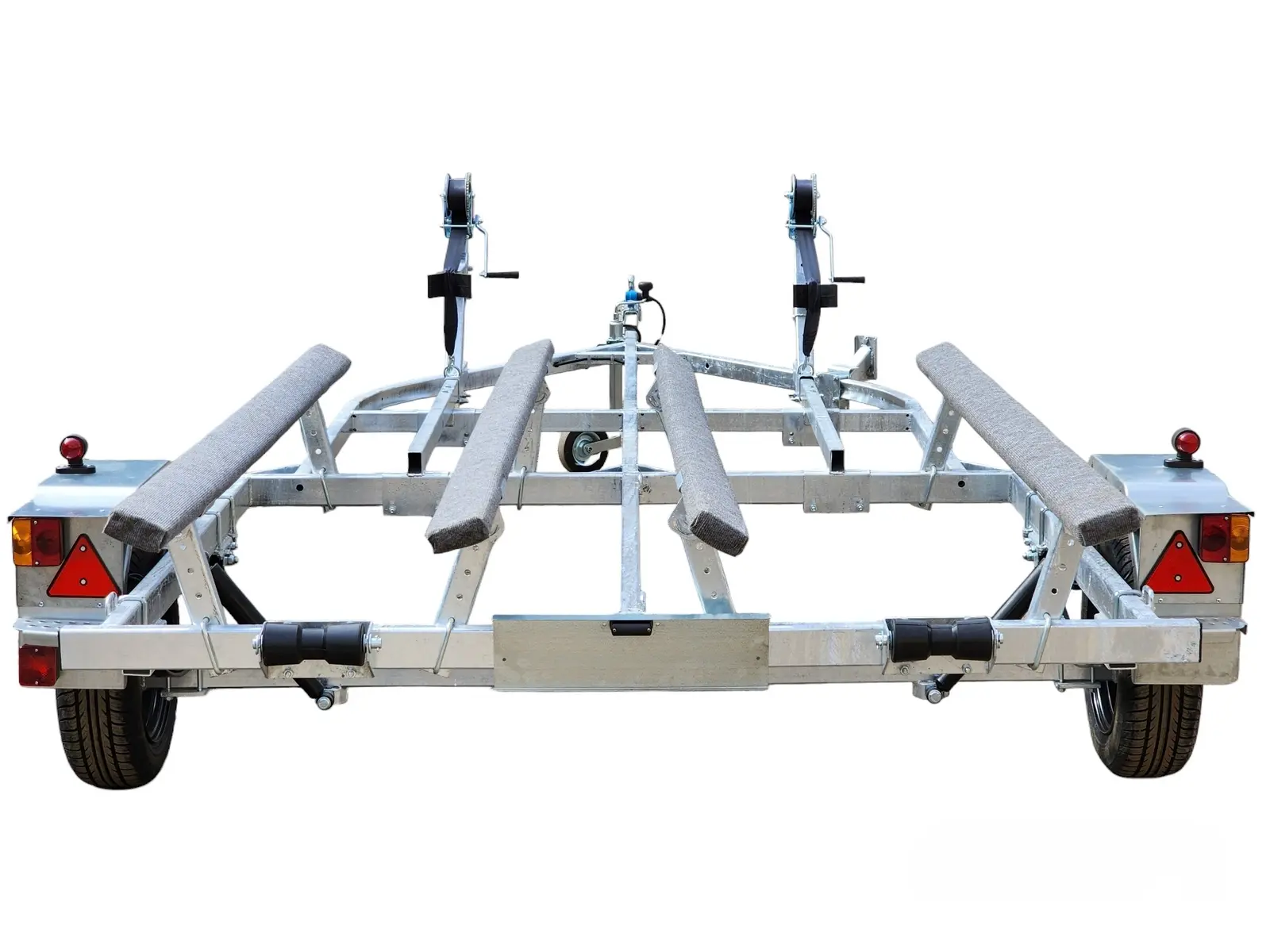 Легковой прицеп для перевозки двух гидроциклов или для перевозки двух лодок. Прицеп одноосный, максимальная длинна плав средства 3,9 м., грузоподъемность - 600 кг.