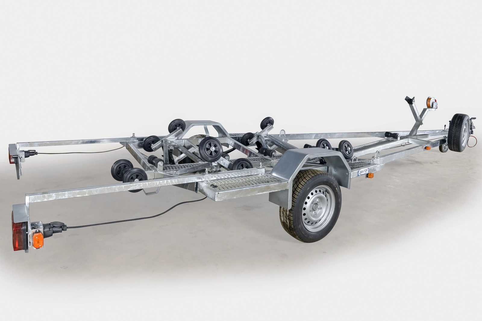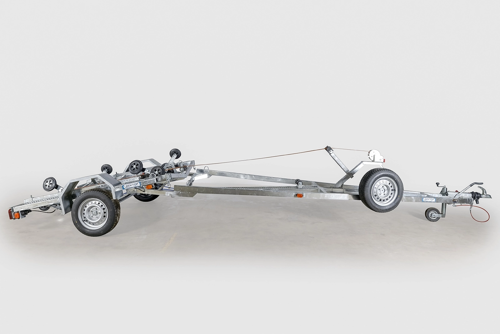 Рама, ось прицепа полностью оцинкованы методом горячего цинкования изнутри и снаружи. Крылья выполнены из оцинкованной стали. Прицеп одноосный, с тормозом наката. Подвеска колес (R14) на двух полуэллиптических переменного сечения рессорах с гидравлическими амортизаторами. Оснащен 4-мя домкратами с качающимися спаренными колесами для установки лодки. Задняя часть рамы опрокидывается для удобства загрузки лодки на прицеп. Оборудован выдвигающимися (до 1000 мм) штангами с фонарями. Сцепное устройство шарового типа, под шар D 50 мм. Полная масса 1300 кг. Грузоподъёмность 915 кг.