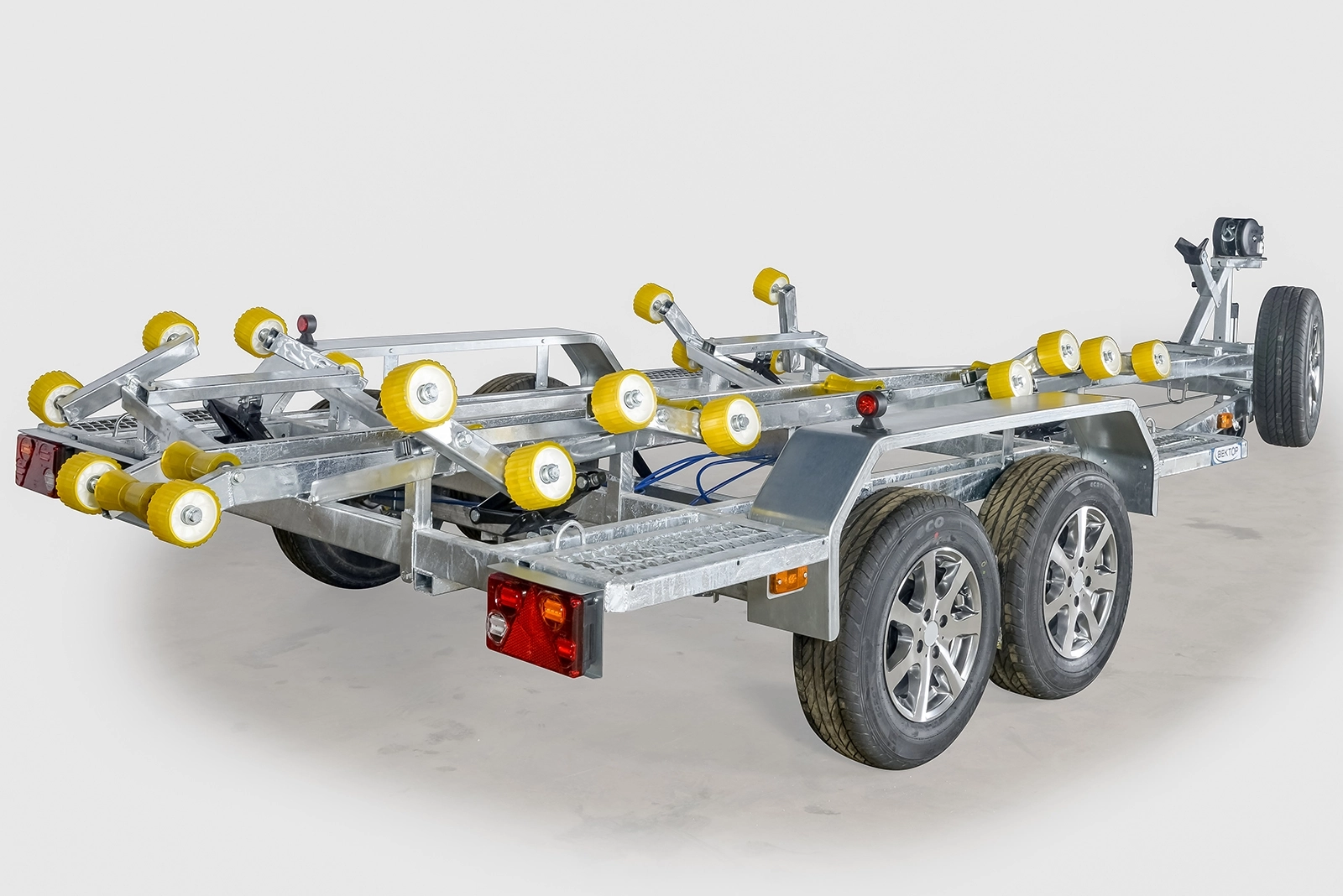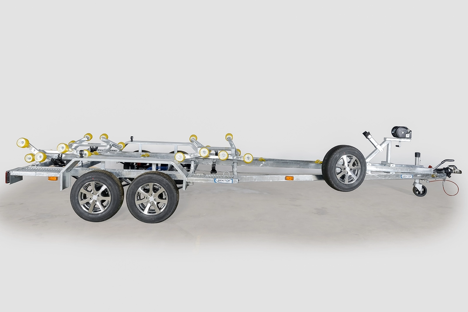 Легковой прицеп для перевозки лодки и для перевозки катера. Прицеп двухосный с тормозом наката, максимальная длинна плавательного средства 7 м., грузоподъемность - 1730 кг.