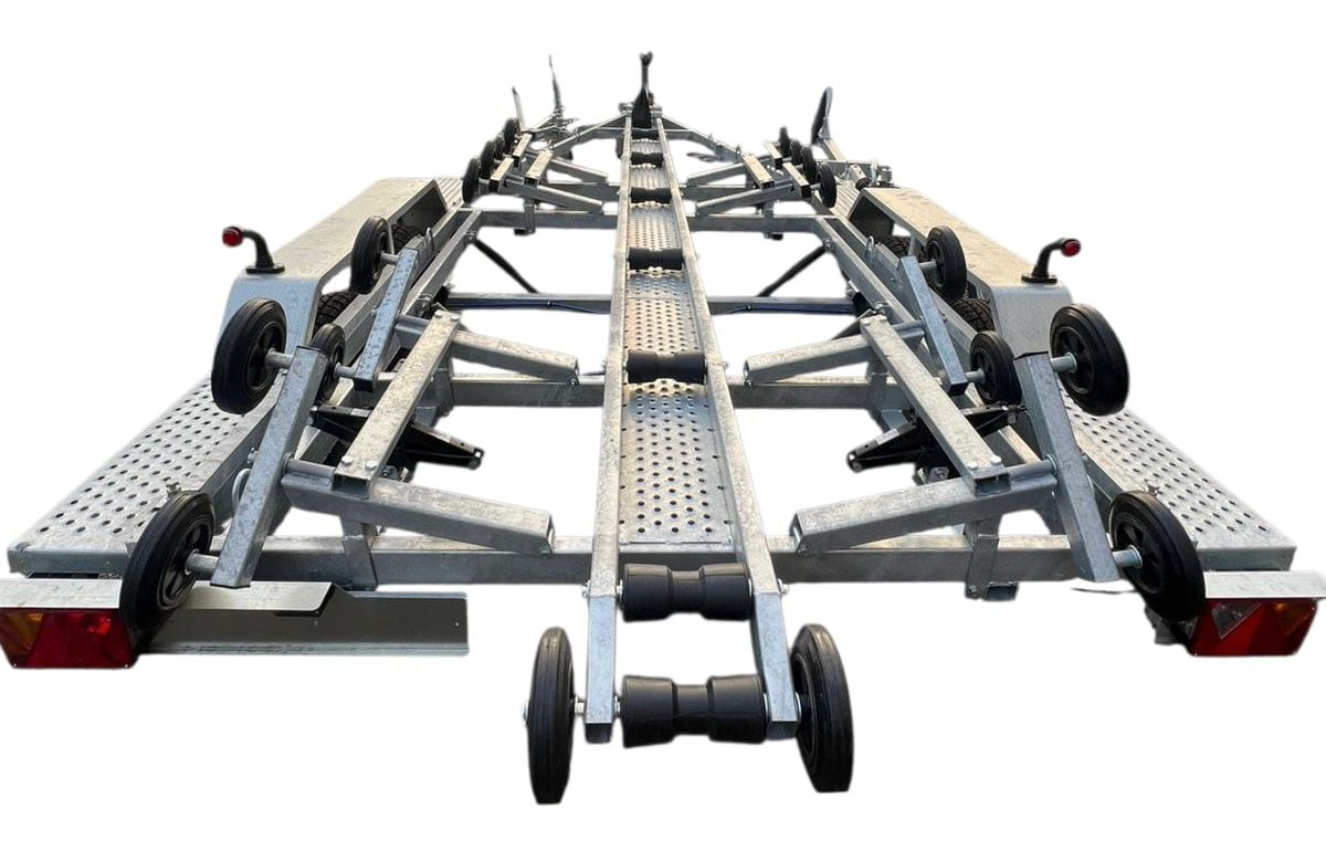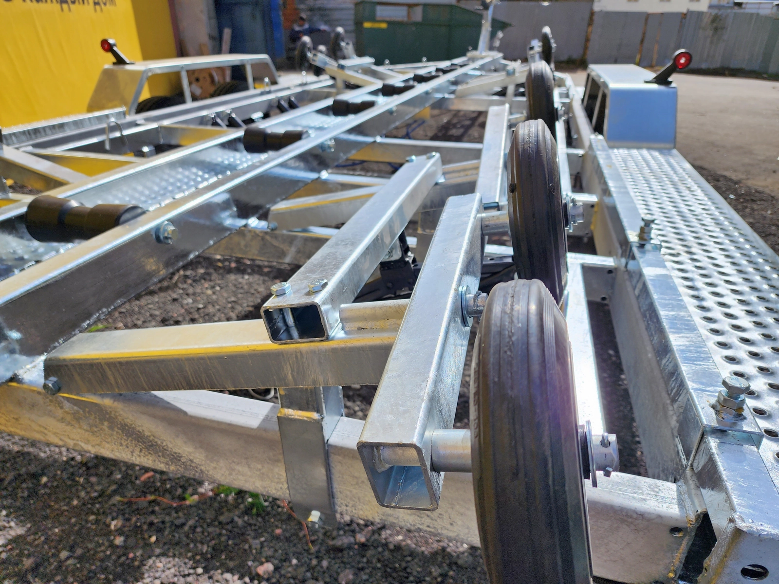 Рама, оси прицепа полностью оцинкованы методом горячего цинкования. Крылья выполнены из оцинкованной стали. Прицеп двухосный, с тормозом наката. Подвеска колес (R14) на четырёх полуэллиптических рессорах с гидравлическими амортизаторами (8шт). Оснащен 4-мя домкратами с качающимися спаренными колесами для установки лодки. Оборудован выдвигающимися (до 1000 мм) штангами с фонарями. Сцепное устройство шарового типа, под шар D 50 мм. Возможен вариант исполнения со сцепным устройством "петля НАТО" диаметром 76 мм. Полная масса 3000 кг.