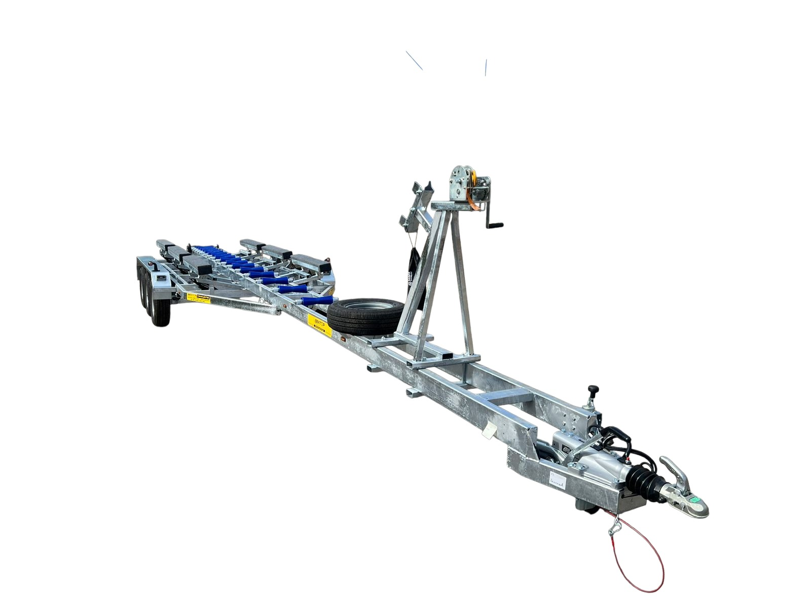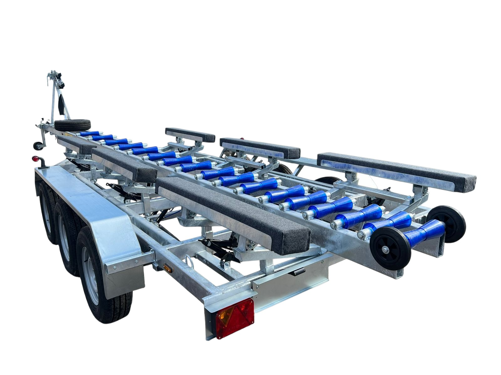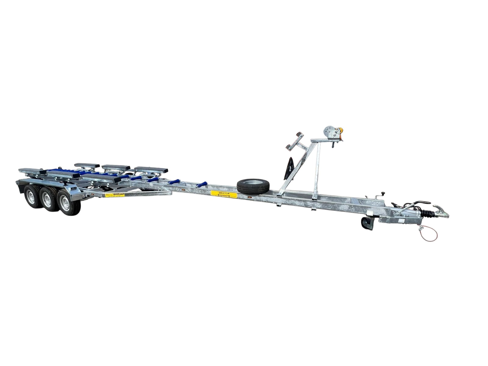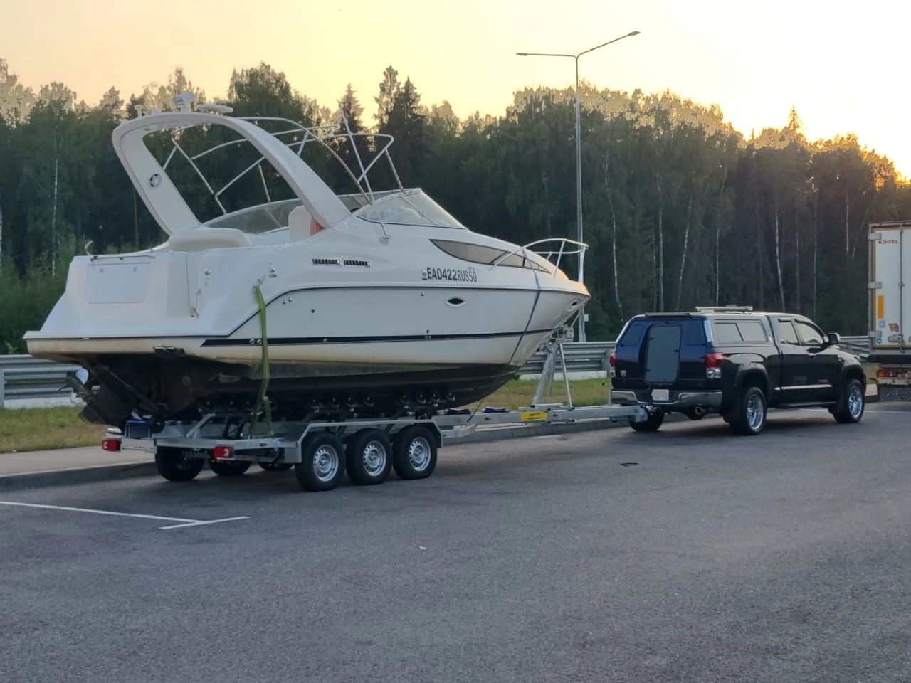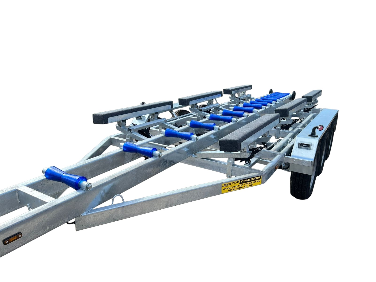 Легковой прицеп для перевозки лодки и для перевозки катера. Прицеп трёхосный с тормозом наката, максимальная длинна плав средства 9,5 м., грузоподъемность - 4100 кг.