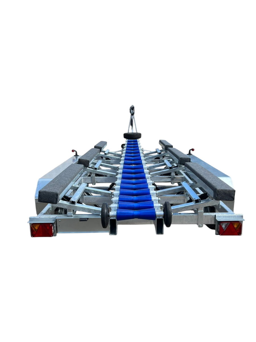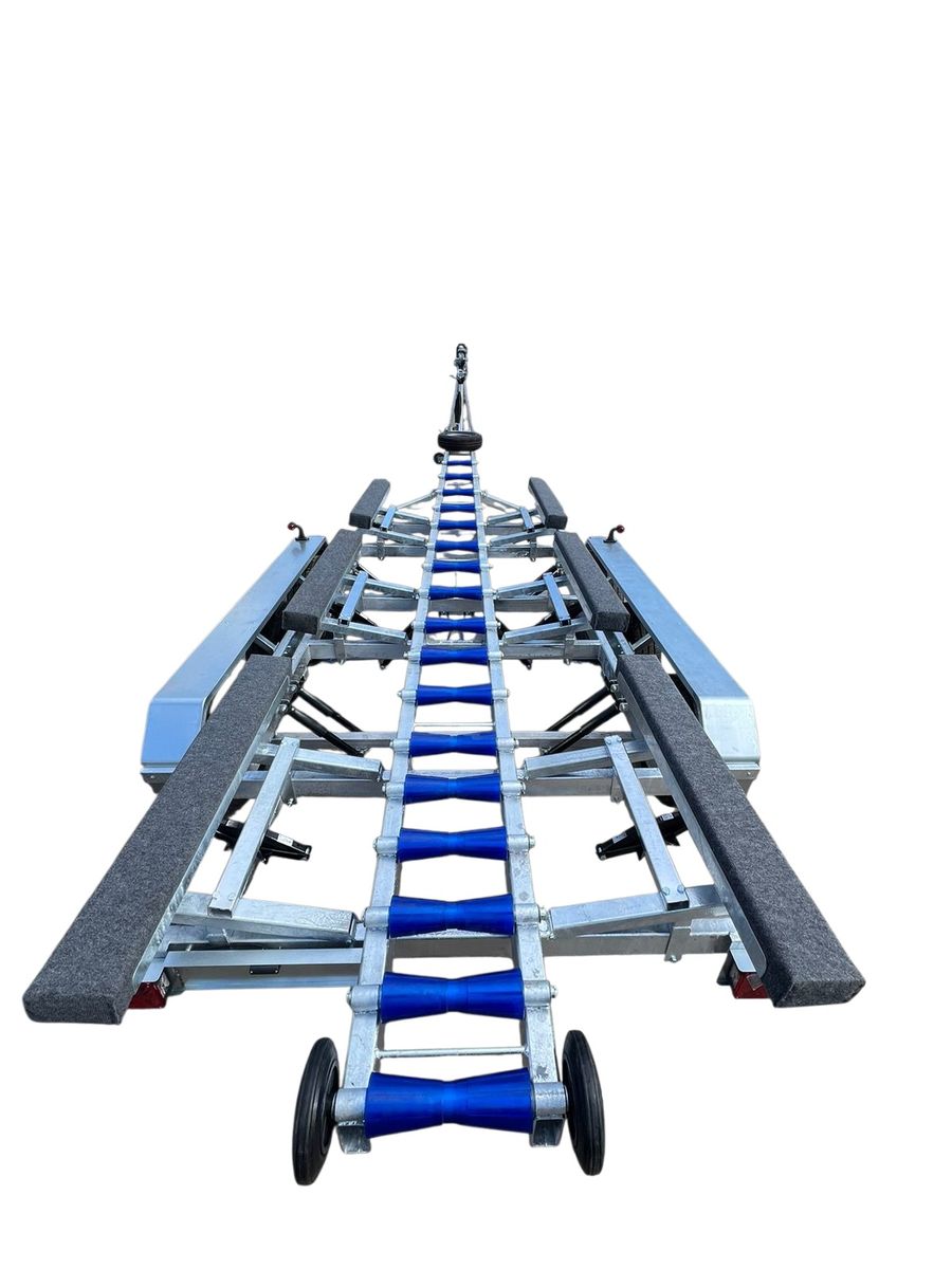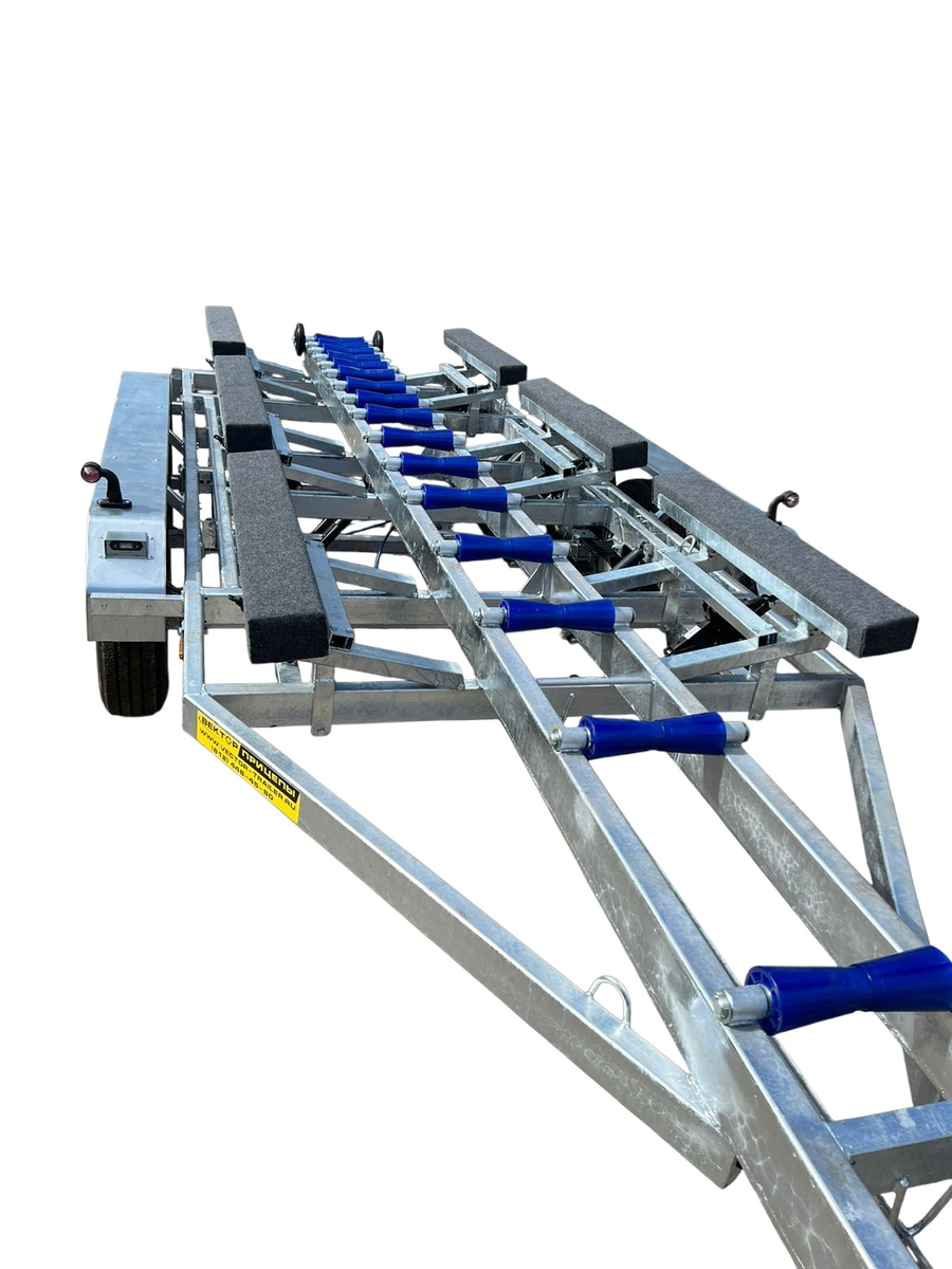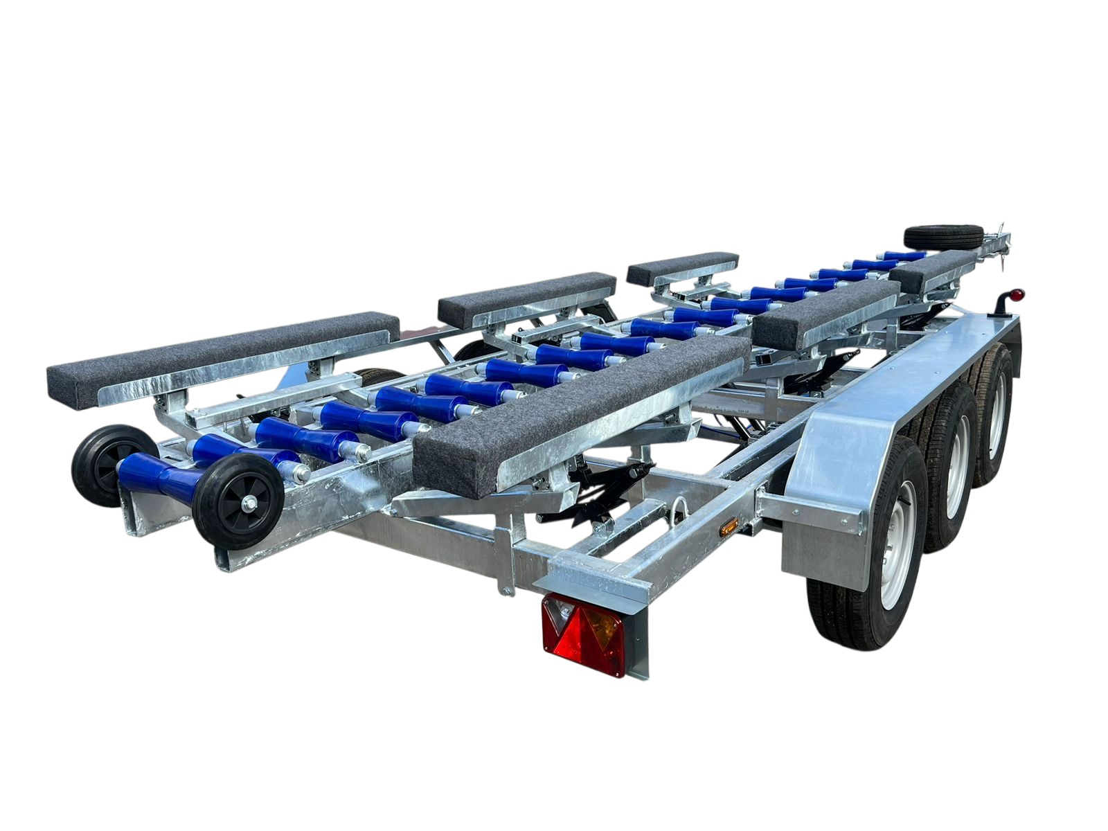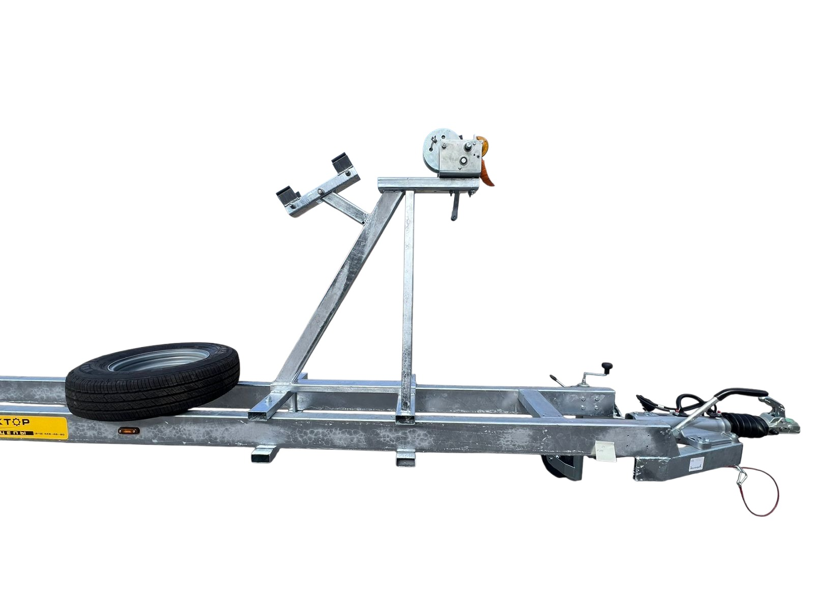 Легковой прицеп для перевозки лодки и для перевозки катера. Прицеп трёхосный с тормозом наката, максимальная длинна плав средства 9,5 м., грузоподъемность - 4100 кг.