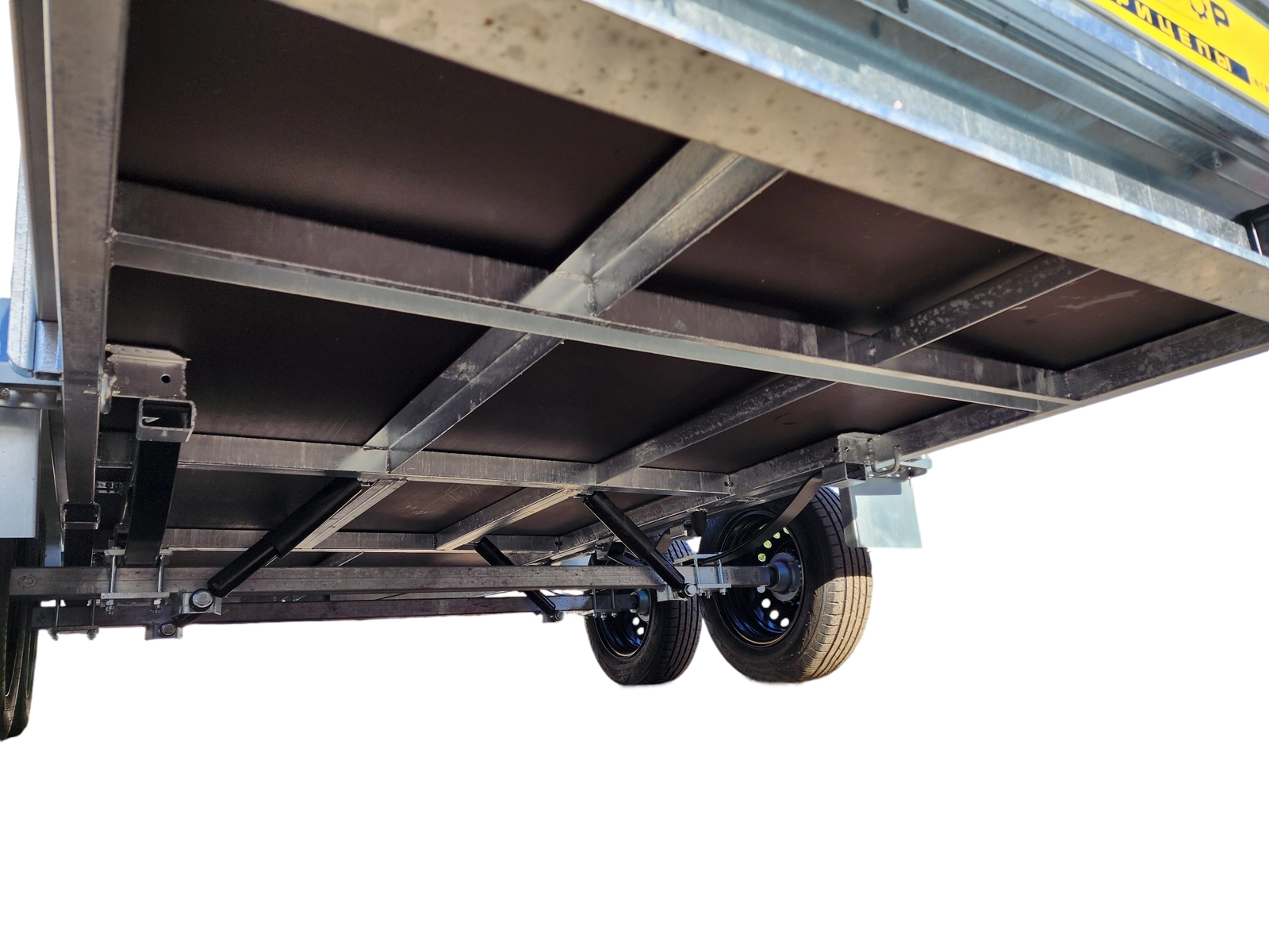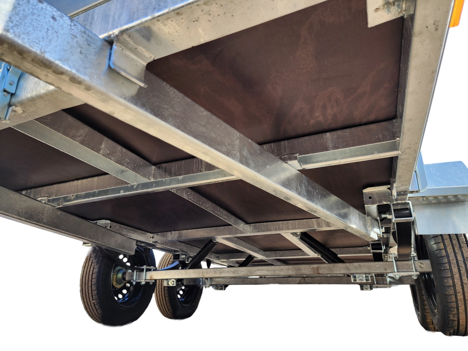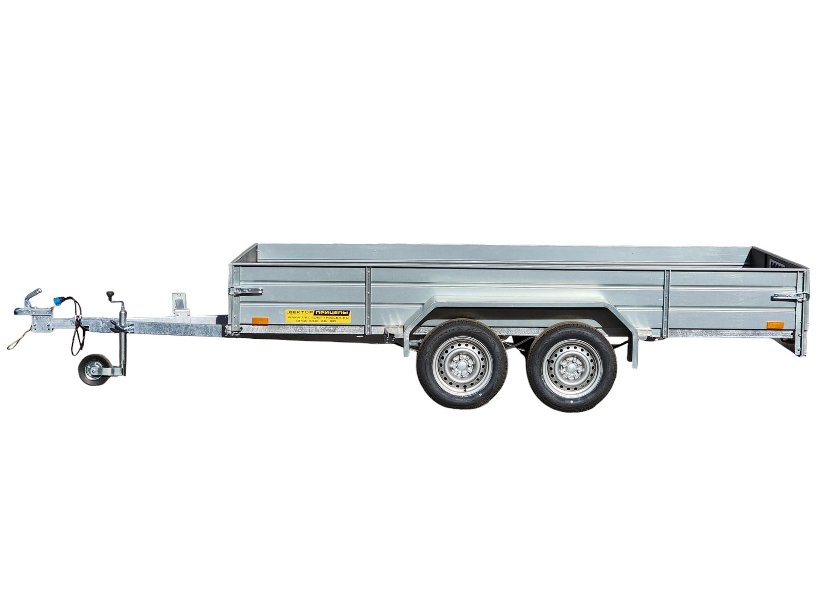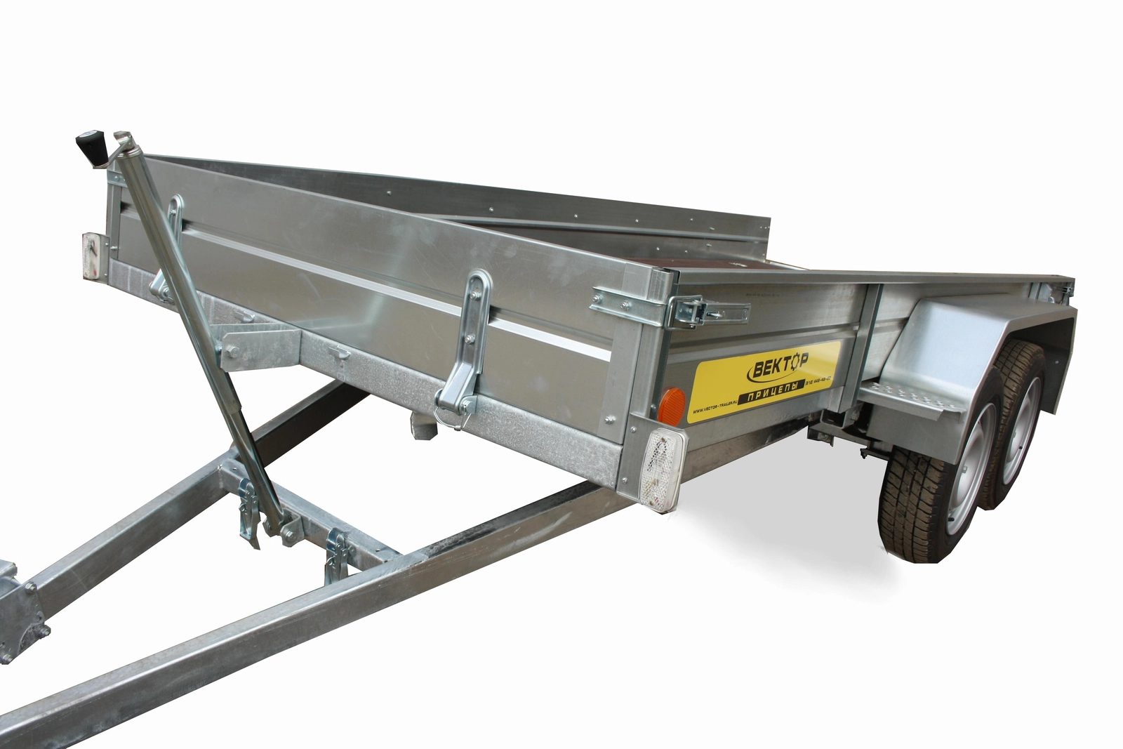 Рама, дышло и ось прицепа полностью оцинкованы методом горячего цинкования изнутри и снаружи. Борта и крылья из оцинкованной стали. Прицеп двухосный, без тормозов, снабжен откидным кузовом, передний и задний борта откидные, с возможностью быстрого съёма. Дышло V-образное. Днище - ламинированная фанера. Подвеска колес (R13) на четырёх полуэллиптических переменного сечения рессорах с гидравлическими амортизаторами. Размеры кузова 3500*1500 мм. Высота бортов 240 или 380 мм. Грузоподъёмность 398 кг.