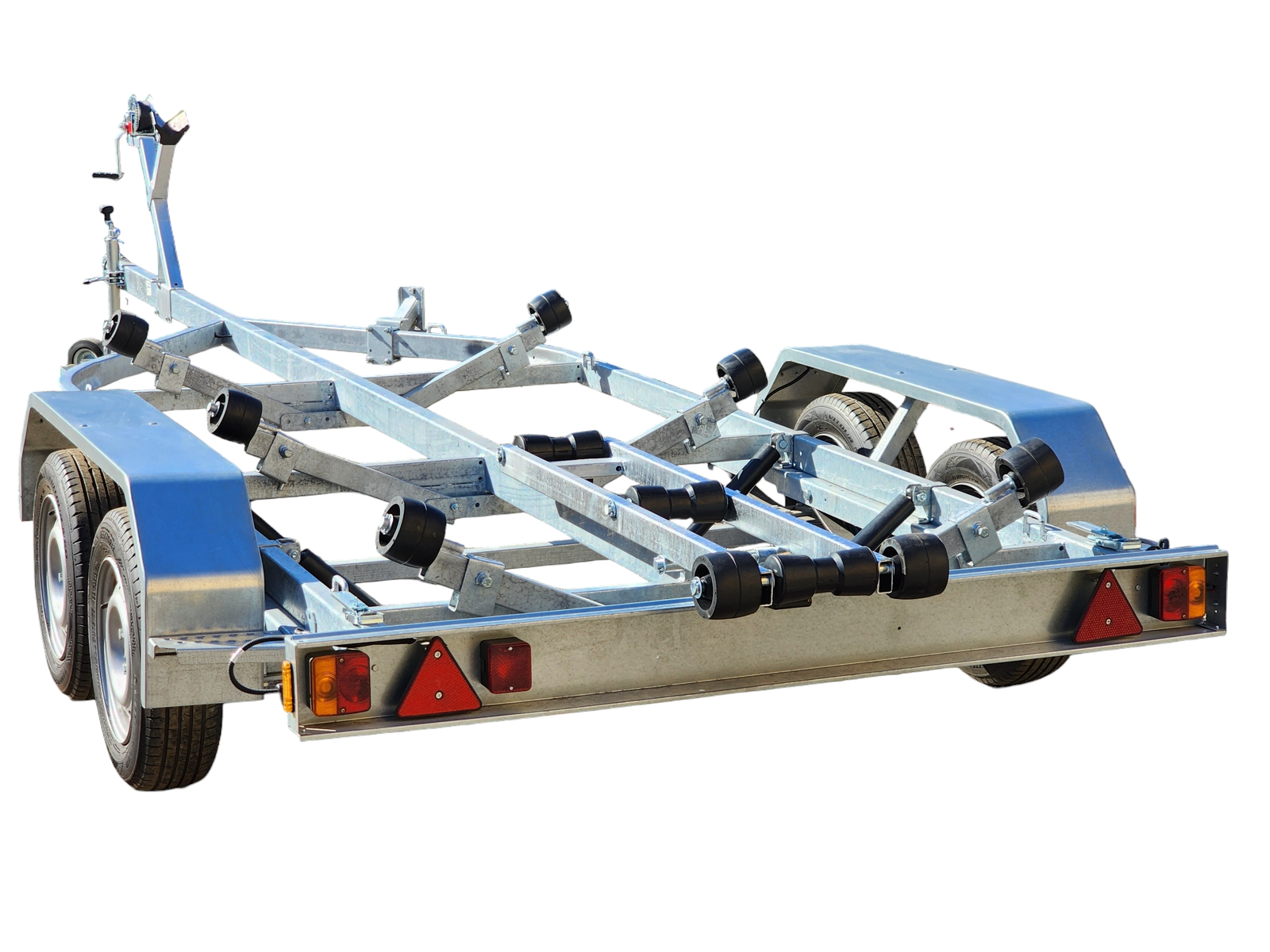 Рама, оси прицепа полностью оцинкованы методом горячего цинкования изнутри и снаружи. Крылья выполнены из оцинкованной стали. Прицеп двухосный, без тормозов. Подвеска колес (R13) на четырёх полуэллиптических переменного сечения рессорах с гидравлическими амортизаторами. Направляющие ролики (6 шт.) или полозы (2 шт.) с регулируемым углом наклона.