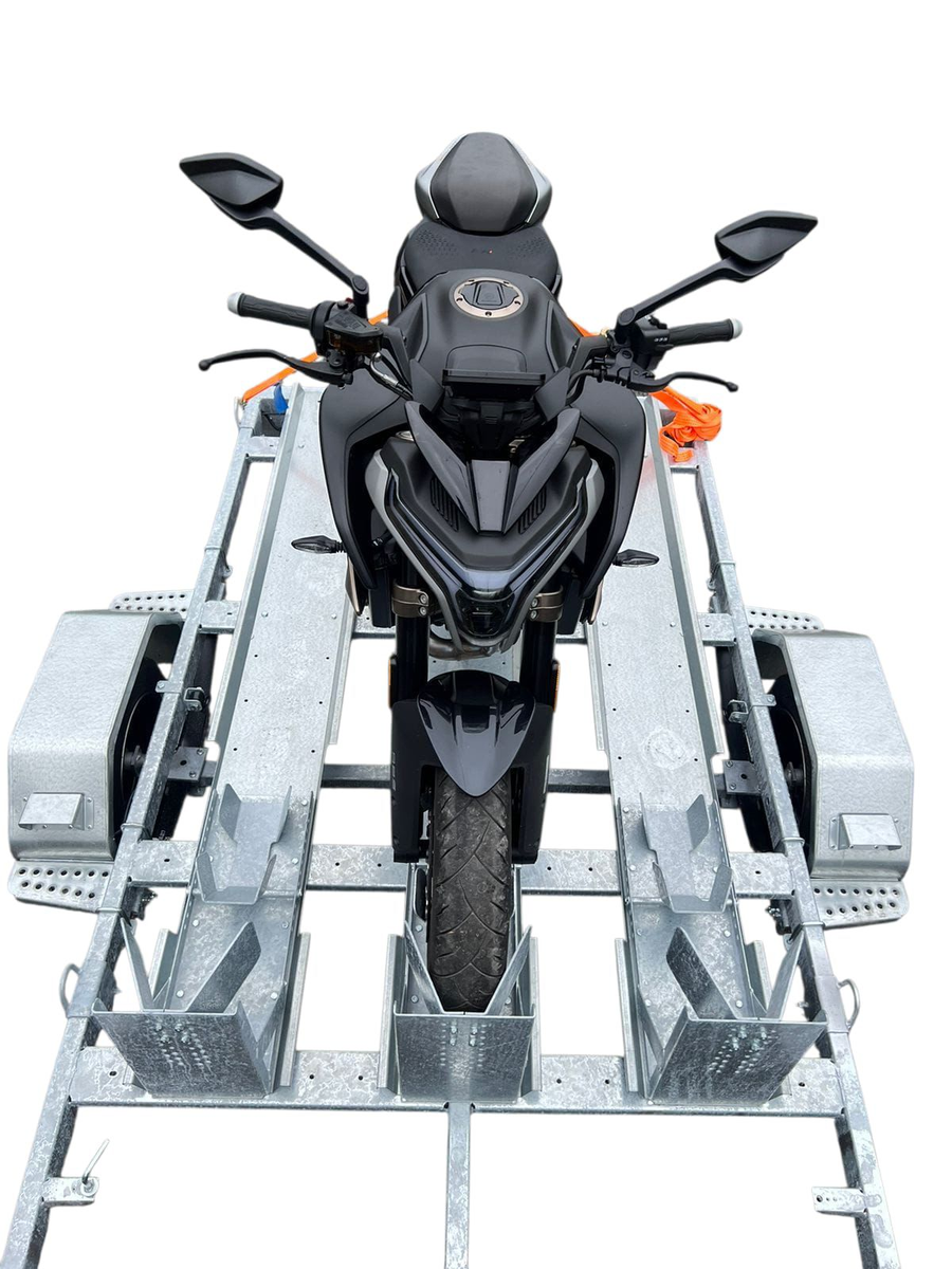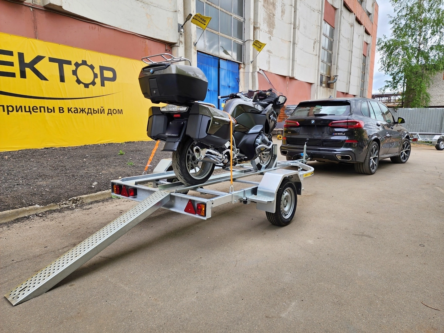 Одноосный прицеп без тормоза ЛАВ-81012 Мото предназначен для перевозки двух мотоциклов одновременно, оснащён направляющими для установки мотоциклов и фиксатором переднего колеса (с шириной фиксирующей "лапы" 90 или 120 мм на выбор) для каждого мотоцикла. Для обеспечения оптимальной нагрузки на сцепной шар, подвеска может быть смещена вперед или назад в зависимости от положения центра тяжести перевозимого груза. Перемещаемые по раме петли крепления груза позволяют надёжно закрепить грузовыми ремнями груз при перевозке. Трап для заезда входит в стандартную комплектацию, при перевозке размещается в передней части рамы прицепа.