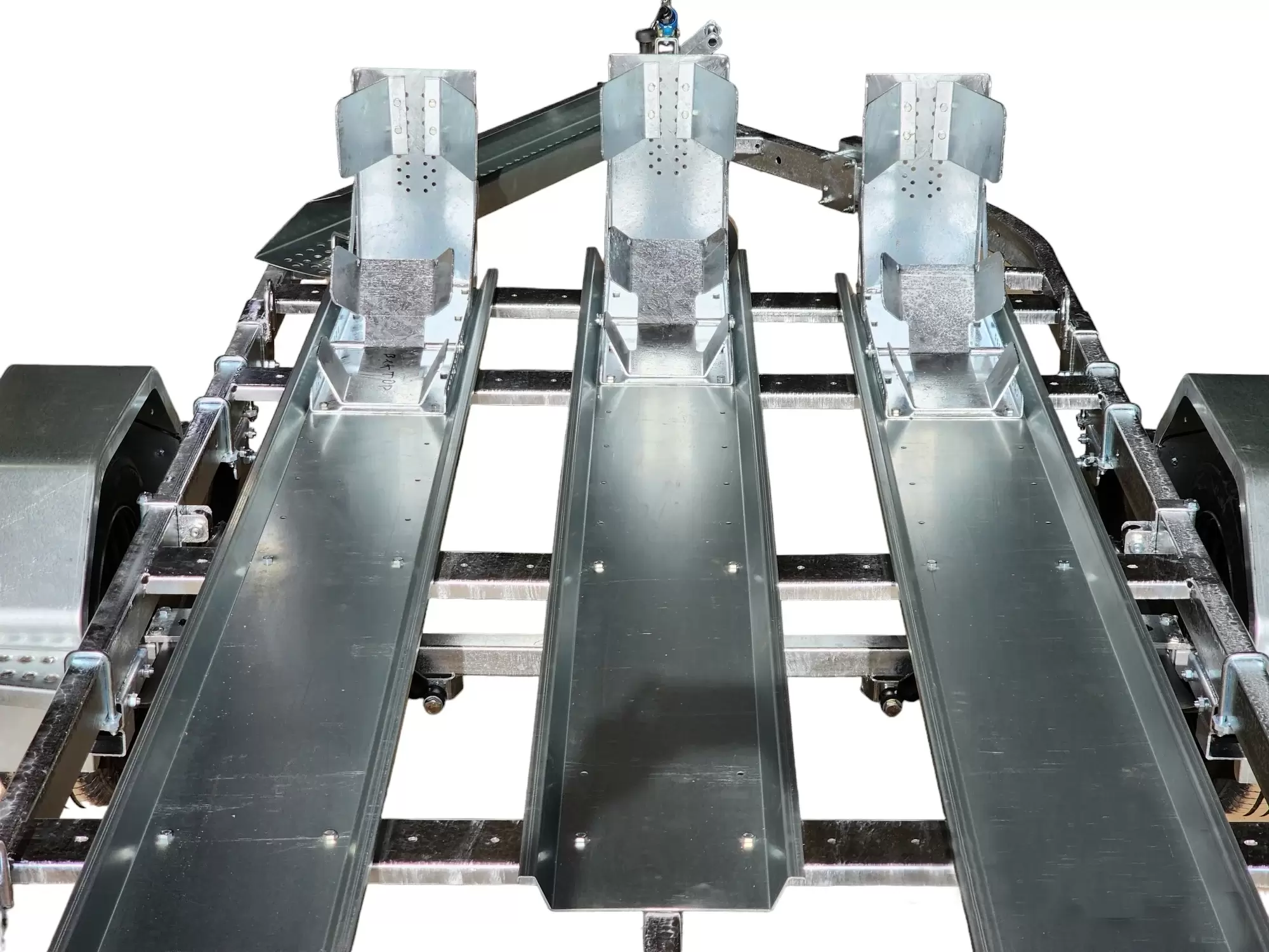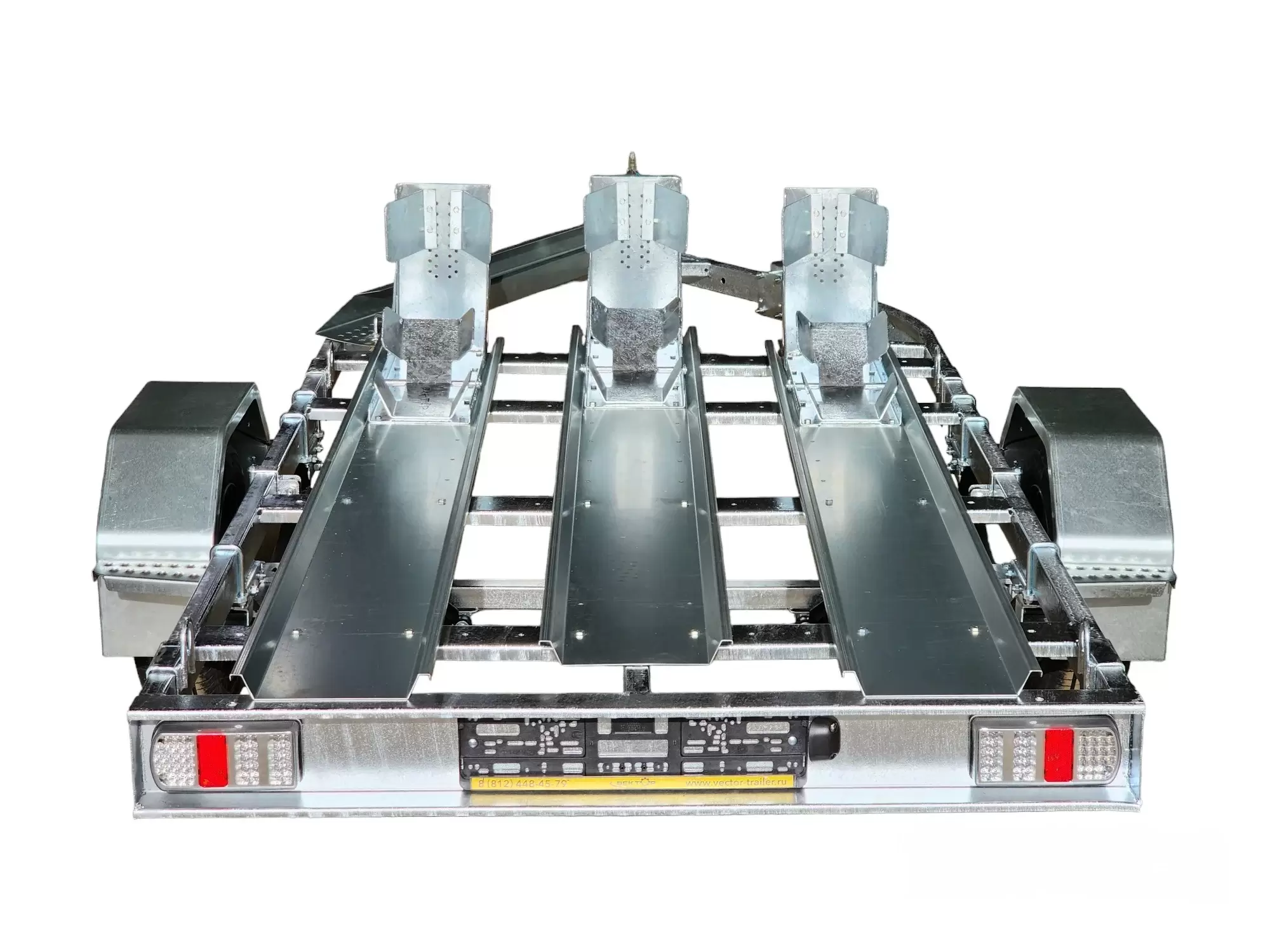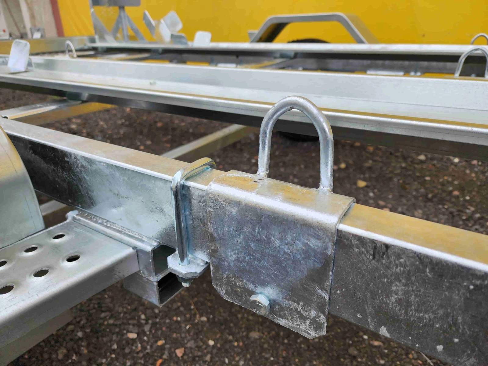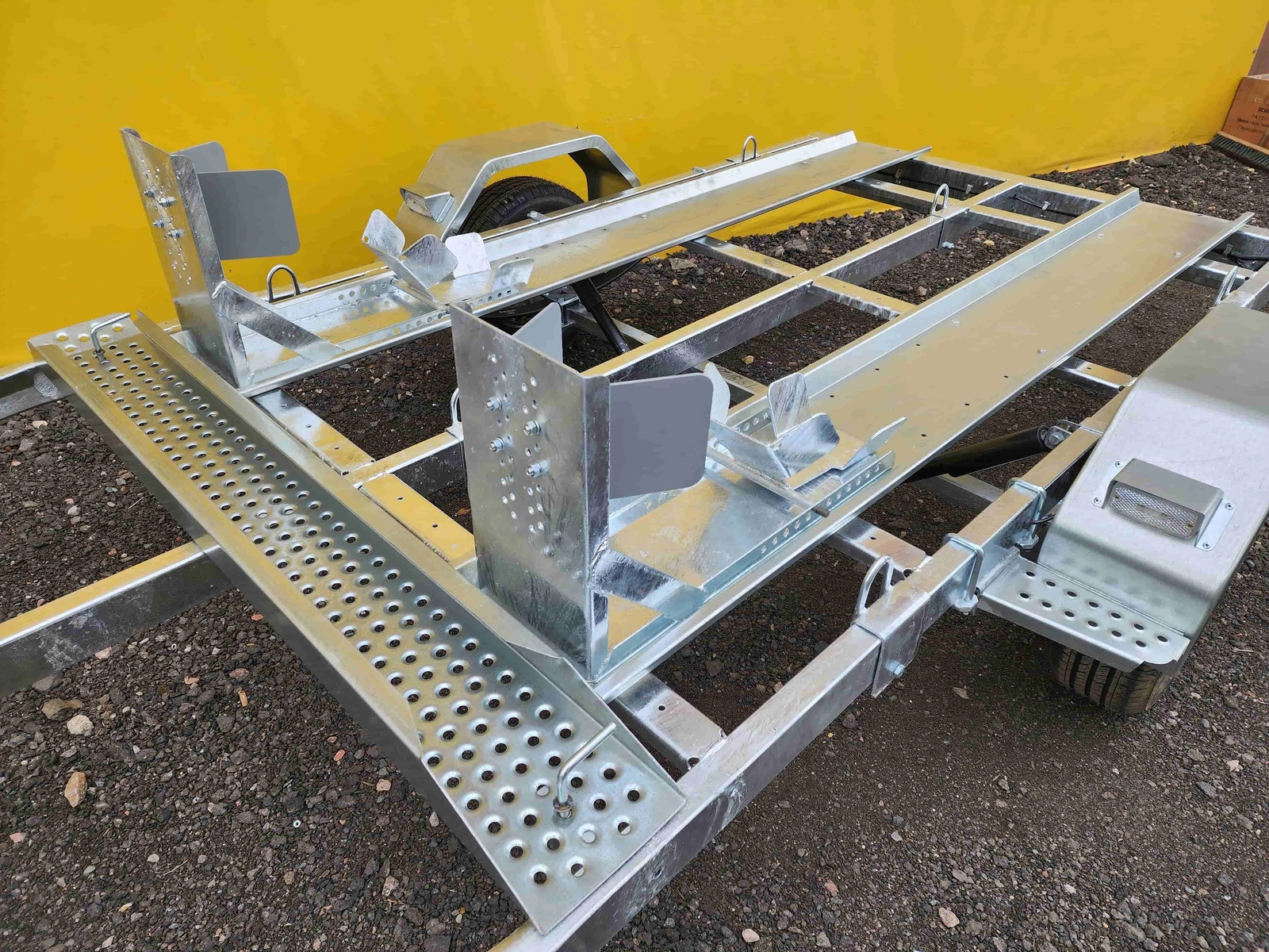 Рама прицепа сварная из труб и профилей, оцинкованная "горячим способом". Традиционно в базовую комплектацию входят: крылья из оцинкованного металла, подножки на крыльях, кронштейн запасного колеса, переходник на разную высоту фаркопа.