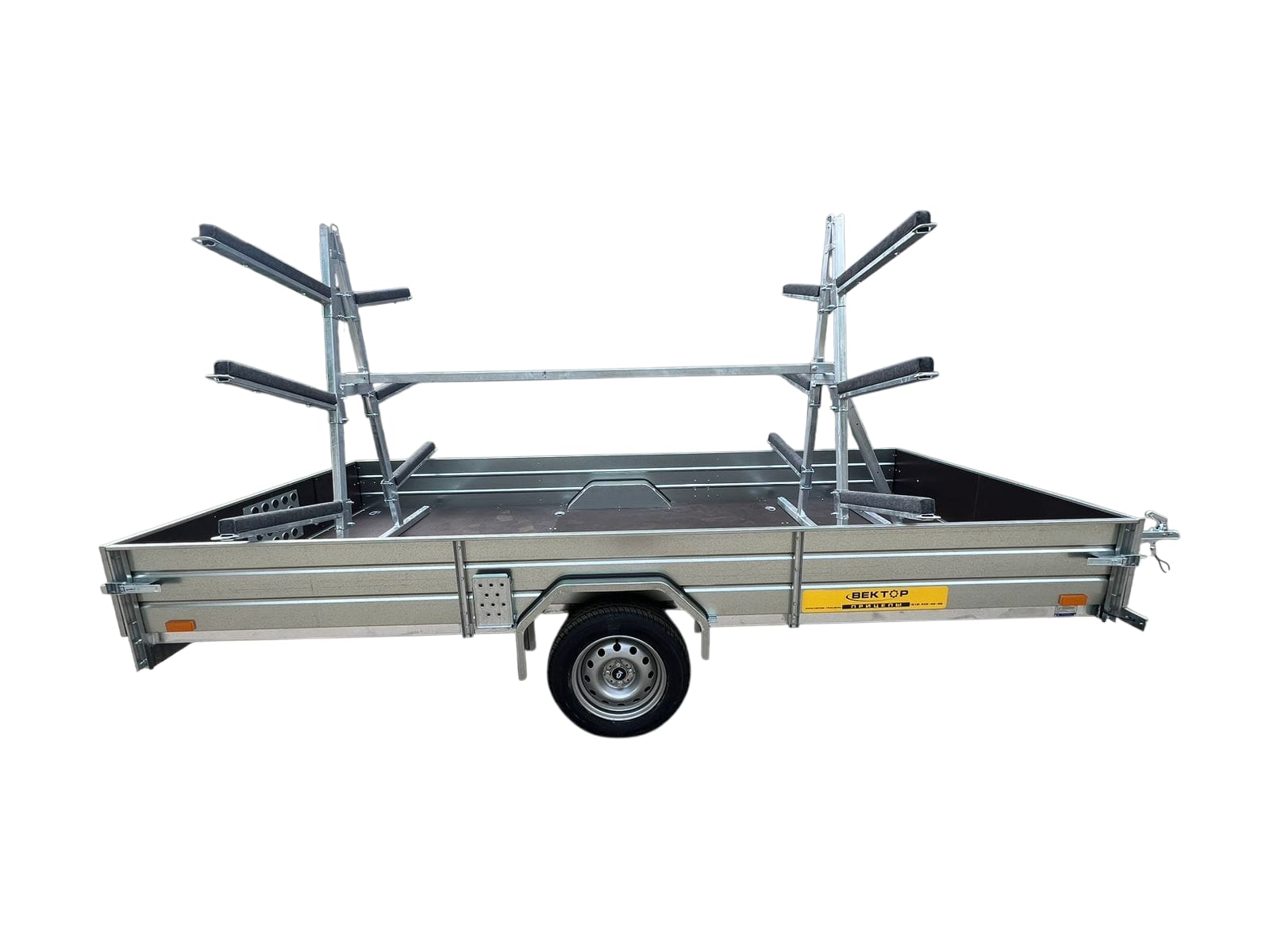 Легковой прицеп ЛАВ 81012С 4.0 (колея 1740 мм) предназначен для перевозки любых грузов, в том числе квадроцикла, мотоцикла, гидроцикла, снегохода, небольшой лодки, лодки ПВХ (надувной лодки) при использовании опции "Салазки для лодки" по всем видам дорог, на которых допускается эксплуатация легковых автомобилей. Рама, дышло и ось прицепа полностью оцинкованы методом горячего цинкования изнутри и снаружи. Борта и крылья из оцинкованной стали. Прицеп одноосный, без тормозов, снабжен откидным кузовом, передний и задний борта откидные, с возможностью быстрого съёма. Дышло V-образное. Днище - ламинированная фанера. Подвеска колес (R14) на двух полуэллиптических переменного сечения рессорах с гидравлическими амортизаторами. Размеры кузова 4000*1800 мм. Расстояние между крыльями 1500мм. Высота бортов 380 мм. Грузоподъёмность фактическая 700 кг.