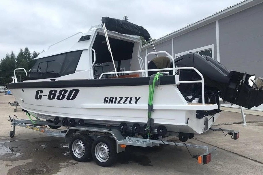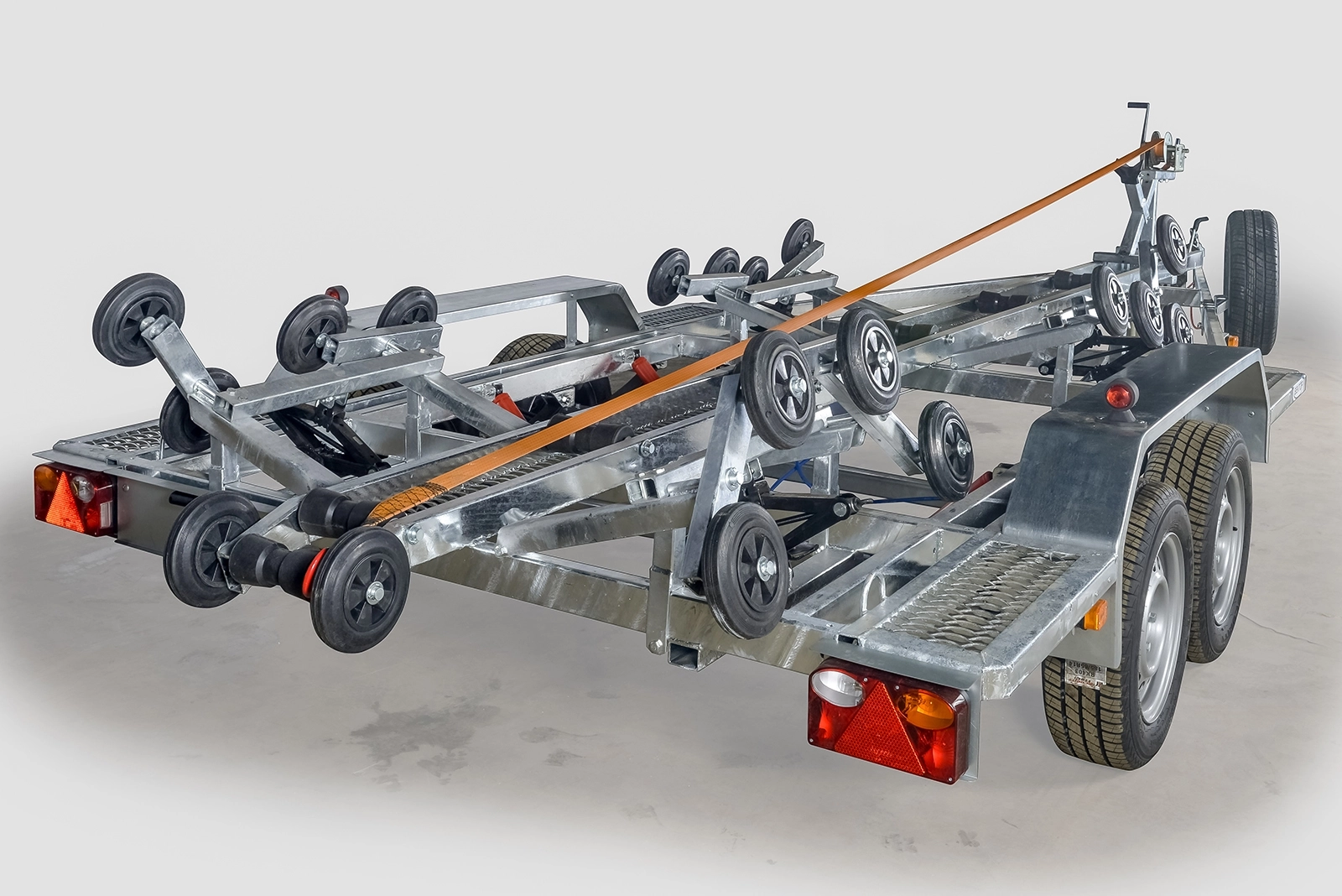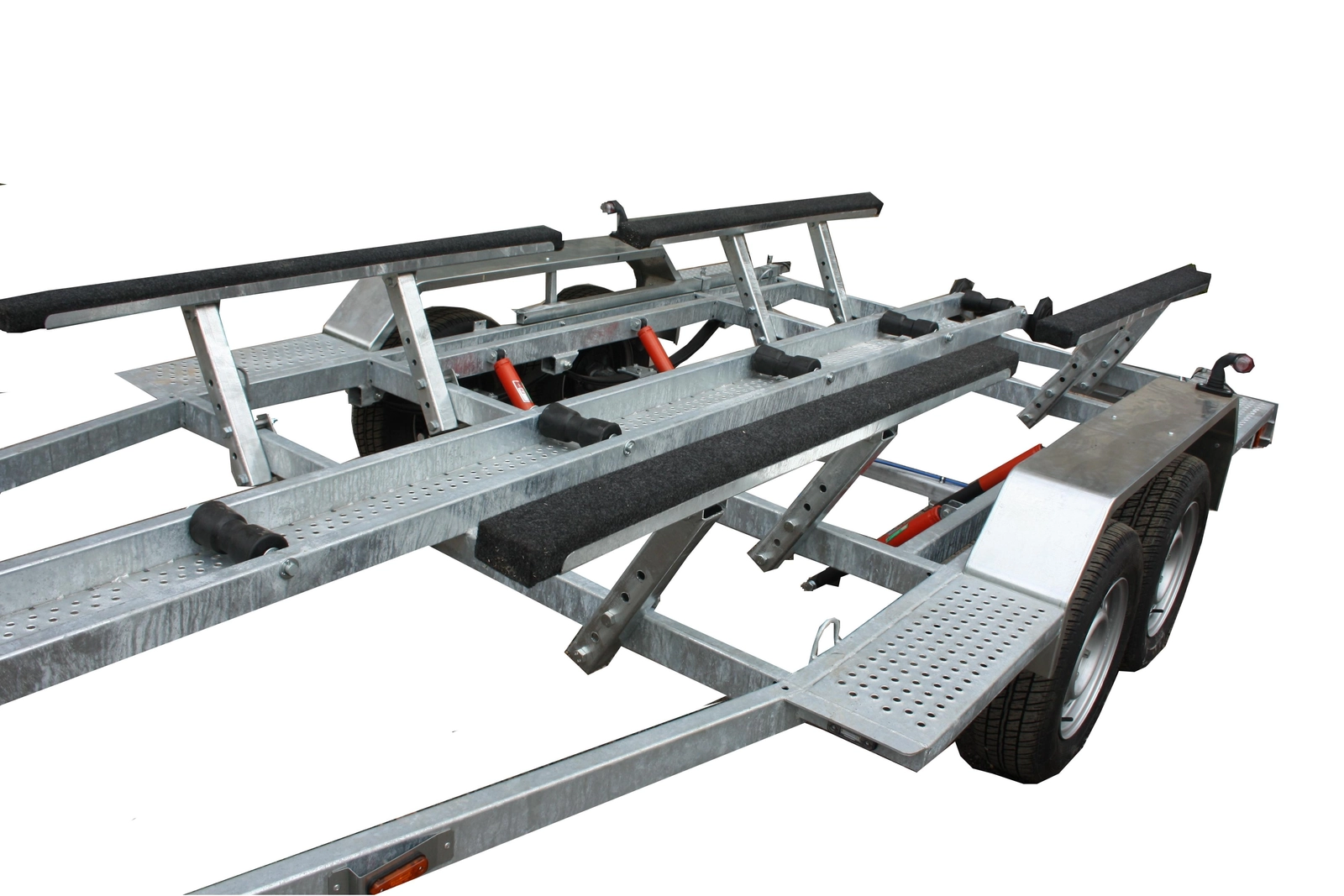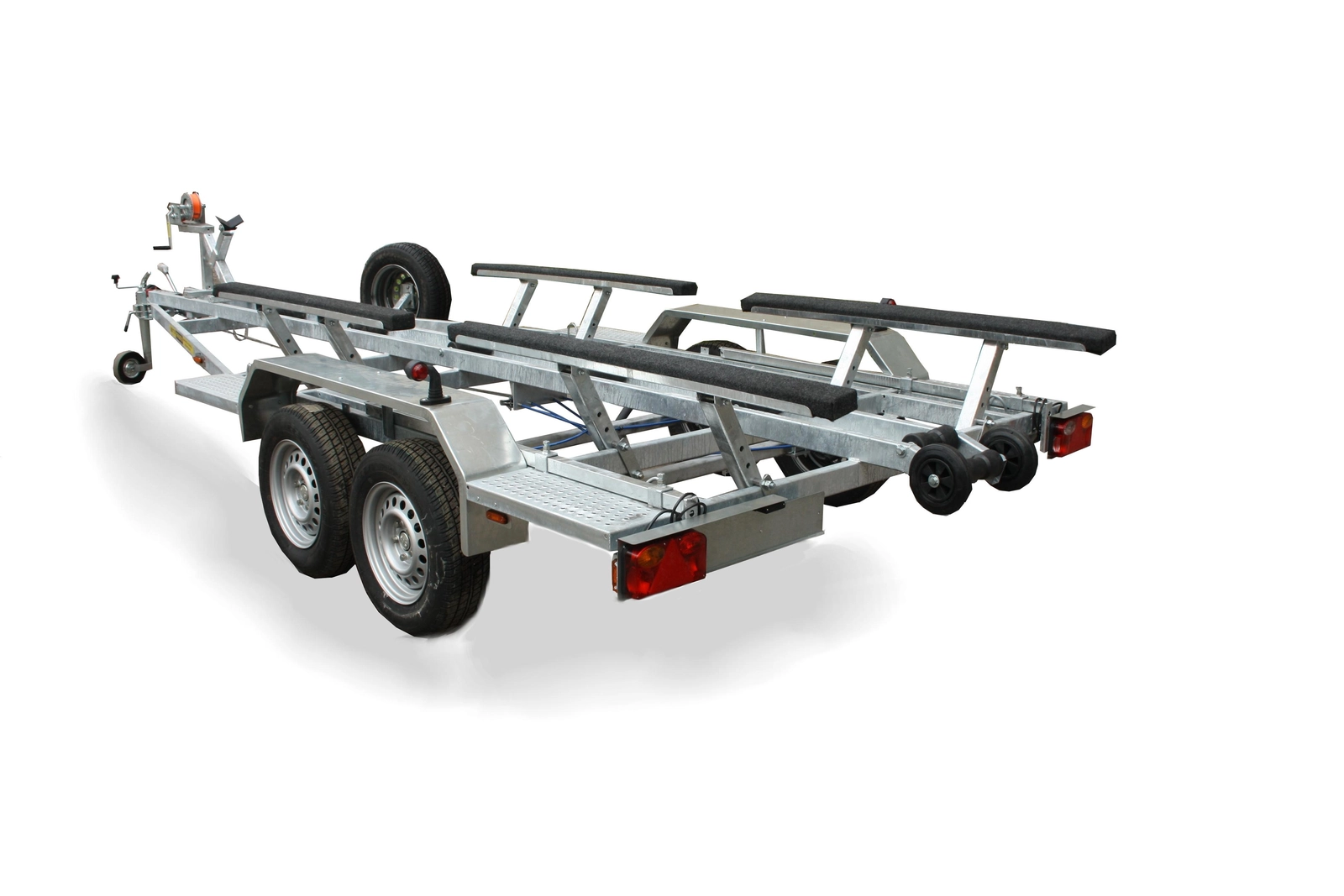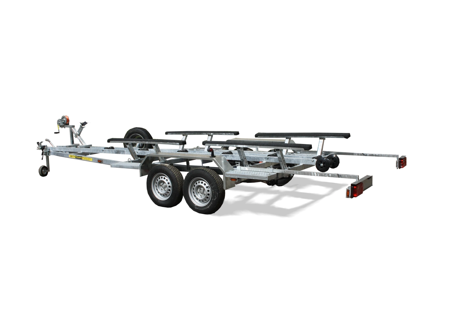 Легковой прицеп для перевозки лодки и для перевозки катера. Прицеп двухосный с тормозом наката, максимальная длинна плавательного средства 7 м., грузоподъемность - 1730 кг.