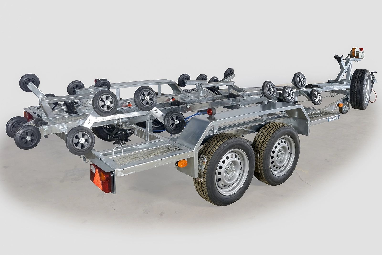 Рама, оси прицепа полностью оцинкованы методом горячего цинкования. Крылья выполнены из оцинкованной стали. Прицеп двухосный, с тормозом наката. Подвеска колес (R14) на четырёх полуэллиптических рессорах с гидравлическими амортизаторами. Оснащен 4-мя домкратами с качающимися спаренными колесами для установки лодки. Оборудован выдвигающимися на 1000 мм. штангами с фонарями. Сцепное устройство шарового типа, под шар D 50 мм. Полная масса 2400 кг. Грузоподъёмность 1730 кг. Габаритные размеры, мм - длина 6750; - ширина 2250; - высота 1240. Опорное колесо, носовой упор с установленной на нём ручной лебёдкой, кронштейн для "запаски", запасное колесо - в стандартной комплектации. Установка опции "направляющие для лодки" возможна только в комплектации с роликами. Категория "Е" обязательна.