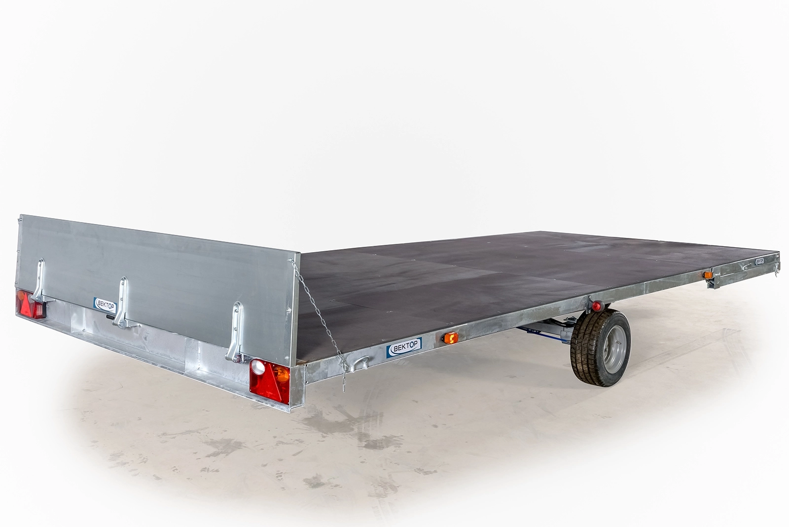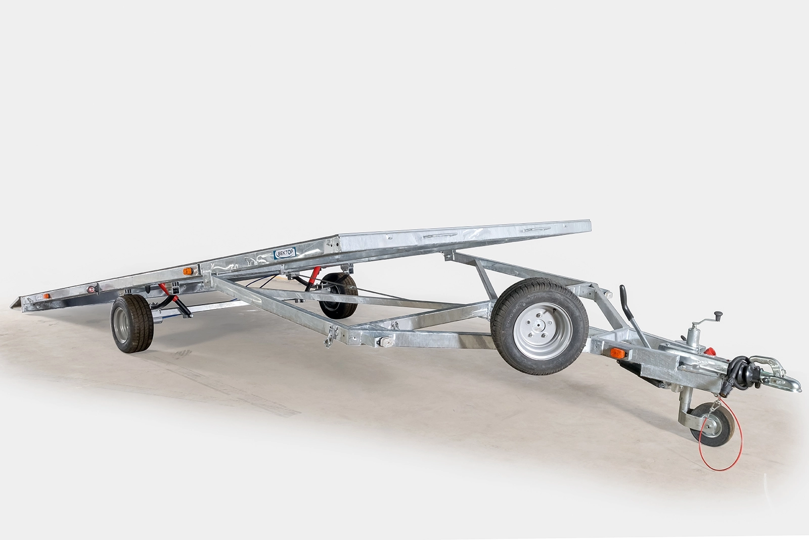 Рама, дышло и ось прицепа полностью оцинкованы методом горячего цинкования. Прицеп одноосный, с тормозом наката. Днище - ламинированная фанера. Подвеска колес (R10) на двух полуэллиптических рессорах с гидравлическими амортизаторами. Сцепное уст-во шарового типа, под шар D 50 мм. Габаритные размеры (мм):- длина 6750; - ширина 2500; - высота 830; - база 4670; - колея 2115. Размеры платформы 5000*2320 мм. Платформа откидывается для удобства заезда техники. Полная масса 1300 кг. Грузоподъёмность 790 кг. Лебедка грузоподъемностью 635 кг, опорное колесо, кронштейн для "запаски" и запасное колесо в стандартной комплектации.