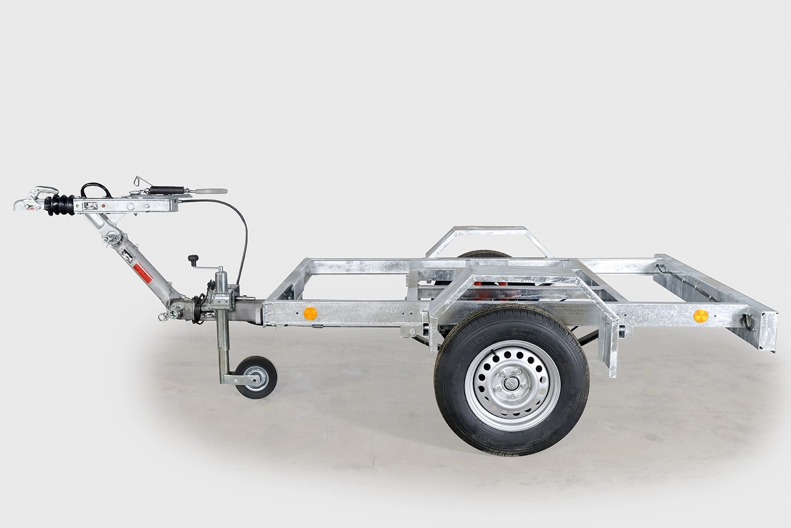 Рама, ось прицепа полностью оцинкованы методом горячего цинкования. Крылья выполнены из оцинкованной стали. Прицеп одноосный, с тормозом наката. Подвеска колес (R14) на двух полуэллиптических рессорах с гидравлическими амортизаторами. Сцепное устройство - "петля НАТО" диаметром 76 мм с регулировкой по высоте. Возможен вариант исполнения со сцепным устройством шарового типа D 50 мм. Габаритные рзмеры: - длина с дышлом 3408-3570; - ширина 1700; - высота 970 max; - колея 1500; - база 2388-2550. Размеры рамы для оборудования 2160*1260 мм. Полная масса 1800 кг. Грузоподъёмность 1480 кг. Опорное колесо в стандартной комплектации. Категория "Е" обязательна.